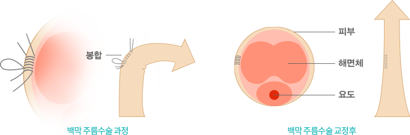 가장 흔하게 시행되는 만곡증 교정방법으로 휜 쪽의 반대측 (정상부위) 백막을 비 흡수성 봉합사로 주름을 잡는 방법입니다(Multiple deep through-and-through plication sutures). 음경 길이가 충분히 길고 휘어진 각도가 45도 이하일 때 시술하게 되는데 특별한 부작용이 없는 안전한 방법입니다.