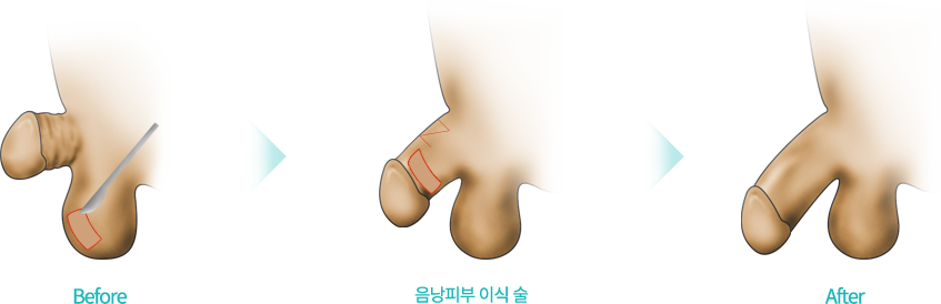 발기시 피부가 당겨지고 통증이 있는 경우 시행되는 수술로 Z-성형술, V-Y 성형술 그리고 음낭식피술을 포함한 피부이식술 입니다.