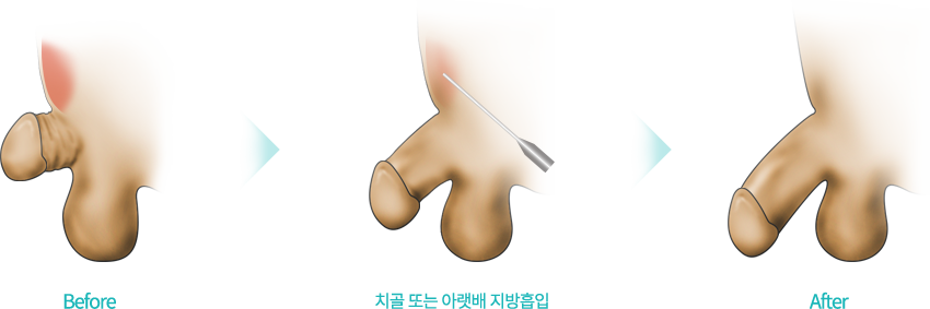 치골에 축적된 지방으로 인해 음경이 함몰된 경우 치골의 지방을 지방흡입하여 음경의 길이연장 효과를 볼 수 있는 방법입니다.