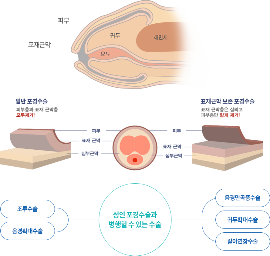 표재근막 보존 수술은 일반적인 포경수술과는 달리 귀두를 덮고 있는 피부를 모두 제거하지 않고 표피층만 얇게 제거를 하고